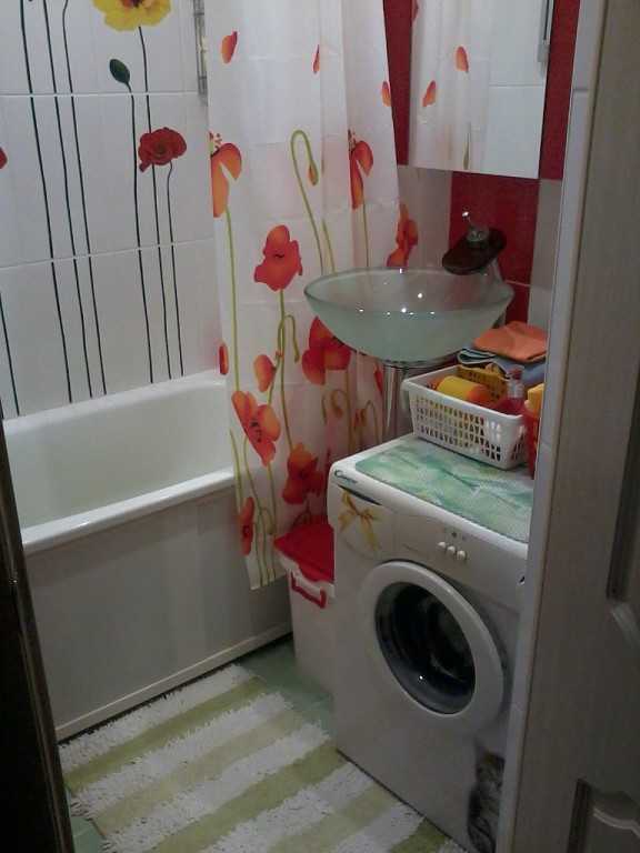 Возможность вмещения стиральной машины шириной 34 см без существенной перепланировки тоже вполне возможна. В этом случае можно использовать умывальник в виде чаши.