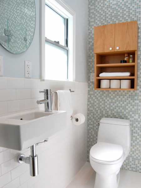 Шкафы подвешивают над унитазом. В них хранят моющие средства, хозяйственные принадлежности, наполнитель для кошачьего туалета и др. В мебели больших размеров может поместиться водонагреватель или стиральная машина. В вертикальном шкафу от пола до потолка легко спрятать все трубы, стояк, бойлер и оборудовать полки. Важно, чтобы санузел был функциональным.