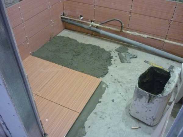 Кафель укладывается по стандартной технологии. Лучше начинать от двери, чтобы спрятать обрезные части в противоположном конце. На поверхность пола площадью в 1 кв. м наносится плиточный клей или цементный раствор. С помощью терки формируют бороздки и на подготовленный участок выкладывают плитку. Обрезанные элементы кладут в последнюю очередь.