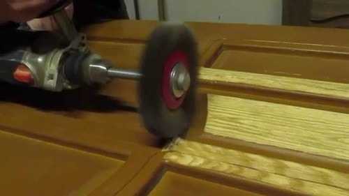 Чтобы новый слой качественно взялся двери нужно ошкурить, проще говоря, сделать шершавыми. Для этого используется либо шлиф-машинка, либо щетка с металлическим ворсом, можно взять насадку на дрель или болгарку.