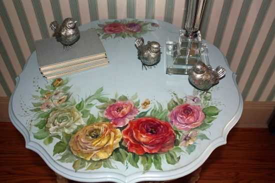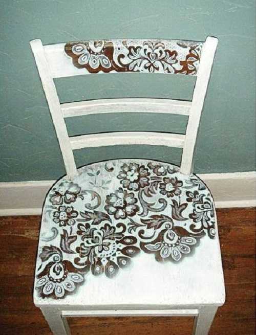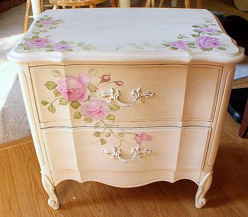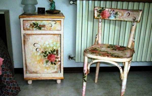- Стоит сказать, что можно не просто перекрашивать старые предметы интерьера, можно их декорировать различными орнаментами. Если вы умеете рисовать — вам не составит сложности сделать это. Если нет — изучите технику декупажа и воспользуйтесь ею с помощью уже готовых вырезок.