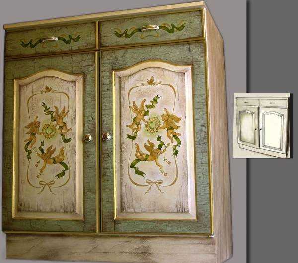 Окрашивание мебели процесс не более трудоемкий, но колер нужно для всех подготовленных плоскостей смешать заранее, ведь даже у опытных мастеров редко получается получить второй раз идеально идентичный тон. В крайнем случае намешанной краски должно хватить на все внешние поверхности, для внутренних легкое расхождение не критично. Декупаж мебели или простейшая роспись по трафарету будут наиболее уместным декорированием.