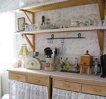 Бабушкин комод и торшер с давно прожженным абажуром, — кажется, что им пора на свалку? Ничего подобного, их время только пришло. Первому потребуется смена растрескавшейся лакировки на сияющую белизной покраску, второму — обновление глянца и перетяжка. Причем, даже покупать дорогую ткань для обновления абажура не потребуется: винтажная скатерть с набивными или вышитыми по кайме цветочками, извлеченная из нижнего ящика того же самого комода, получит вторую жизнь. Остатки этой же скатерти можно перешить на чехлы для стульев, что избавит от необходимости менять купленные ранее современные модели на искусственно застаренные образцы. Стол прикрывается салфеткой из грубого льна, а на диван набрасывается однотонное покрывало с кружевной вставкой.