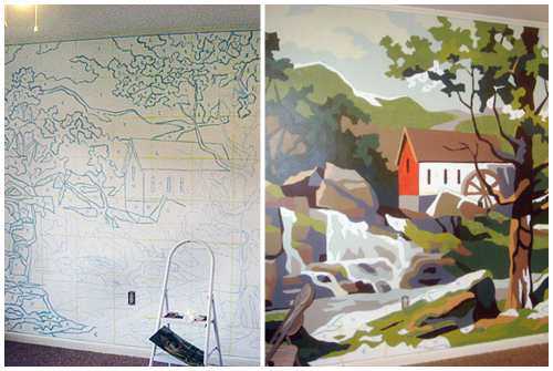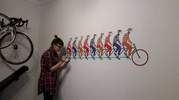 Если вам нужно перевести на стену сложный рисунок с множеством деталей, например, велосипедистов из примера выше, мой вам совет: возьмите напрокат или одолжите у знакомых проектор. Это действительно облегчит вам жизнь. Просто выведите вашу картинку на стену и обведите карандашом: меньше времени, меньше нервов, а результат лучше и ровнее.