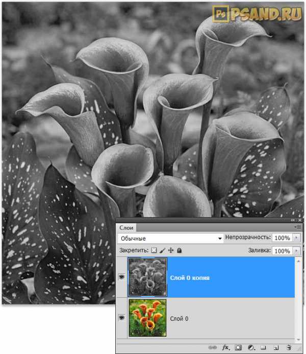 Продублируйте этот слой — сочетание клавиш Ctrl+J. Сделайте активной новую копию и обесцветьте ее сочетанием клавиш Ctrl+Shift+U.
