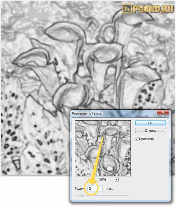 Применяем фильтр: Фильтры -> Размытие -> Размытие по Гауссу (Filter -> Blur -> Gaussian Blur) с радиусом около 2 пикселей.