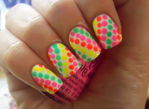 Но если пятнышки получились не ровные, то не отчаивайтесь, ведь они и не должны быть все одинаковы, в этом и преимущество этого рисунка на ногтях.