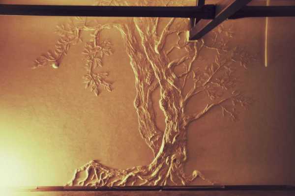 Рельефная картинка может быть вырезана из обыкновенного пенопласта. Лучше использовать материал плотностью не ниже С-25 (25 килограммов на кубометр) — более рыхлый С-15 слишком легко крошится. На роль ствола и ветвей пойдет как листовой утеплитель, так и фрагменты упаковок бытовой техники.