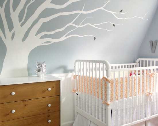 Деревья и птицы на стене буду придавать комнате особый стиль