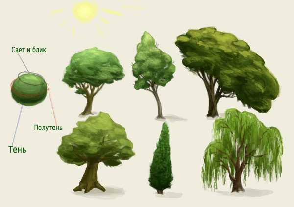 После того как основные краски подобраны и нанесены стоит придать некой объемности. Для этого, в зависимости от освещения, нужно показать тень и свет на всей кроне, не выделяя ветки и на стволе.