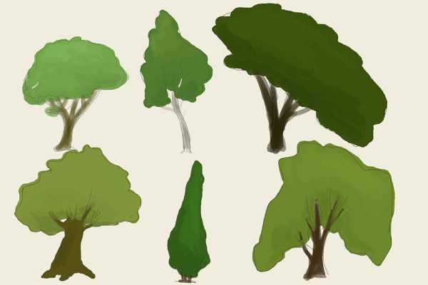 На этом этапе важно подобрать удачный оттенок для листвы и ствола, характерный именно этому виду деревьев и соответствующий освещению.