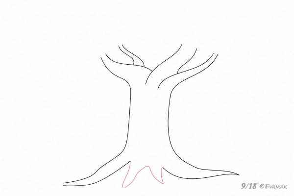 Основные корни дерева тоже большие. Такие корни выросли первыми и являются длиннее остальных. Нарисуйте их слева и справа с помощью изогнутых линий. В центре оставьте место для других корней.