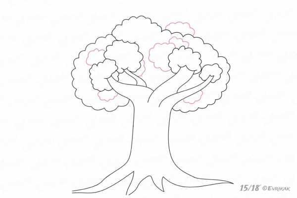 Соединяем части кроны, на ветках рисуем растительность, похожую на маленькие кустики.