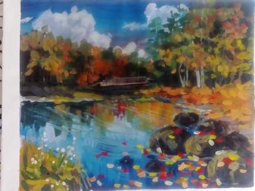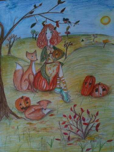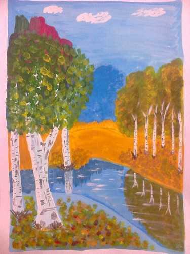 Очень интересны рисунки детей красками на тему «Золотая осень». Ведь если дать юным художникам свободу действий, то можно получить весьма неожиданный результат. Некоторые видят ее в образе красавицы с длинными волосами, украшенными листьями. Другие же рисуют деревья с багряной и желтой листвой на фоне водоема.