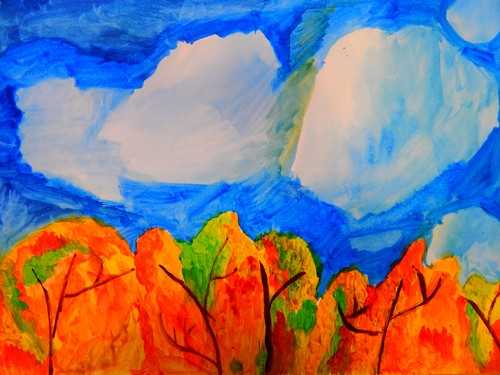 Сначала просто попробуйте вместе с ребенком пофантазировать про осень – ведь детские рисунки, нарисованные красками, часто рождаются именно как его мечты о чем-либо. Если малыш еще не совсем понимает, как получаются осенние цвета, то организуйте для него мастер-класс по смешиванию красок. В этой работе будут задействованы коричневый, желтый, оранжевый, зеленый и белый цвета.