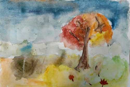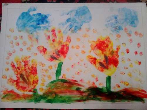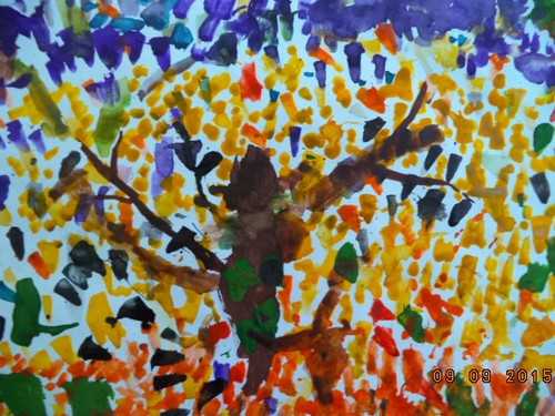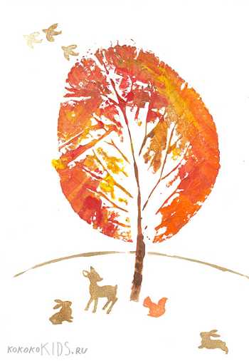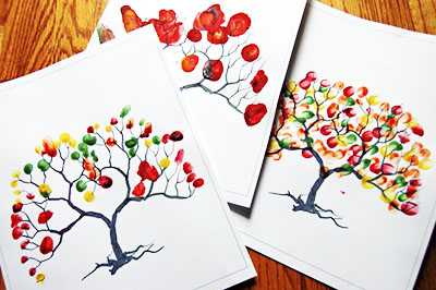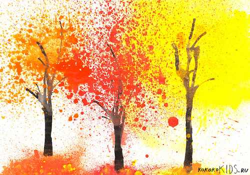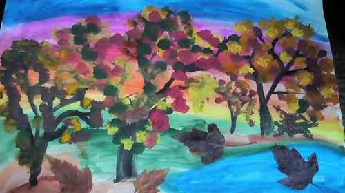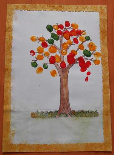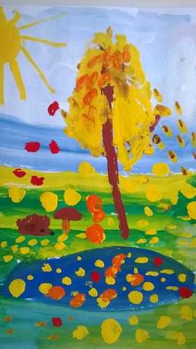 Например, детям 3-4 лет вполне по силам будет изобразить осеннее дерево путем нанесения пальчиком на основной ствол капелек сочных красок.