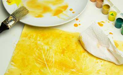 Для работы мы готовим тонкую бумагу, настоящие осенние листья (которые собираем в процессе прогулки), свечу, кисть и краски.