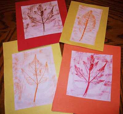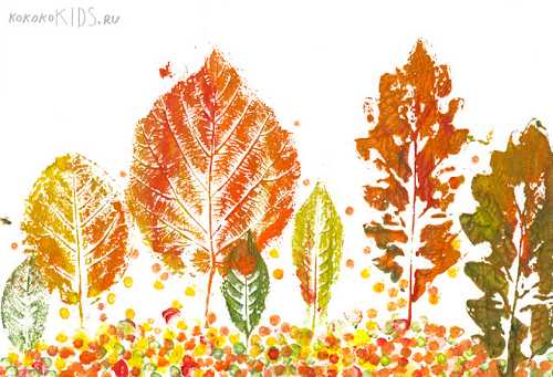 Снова используем свежесобранные осенние листики. Покрываем каждый из них слоем красок осенней палитры и аккуратно переворачиваем на лист белой бумаги. Осторожно поднимаем листок – на его месте остается разноцветный отпечаток.