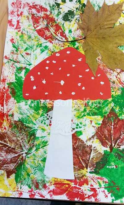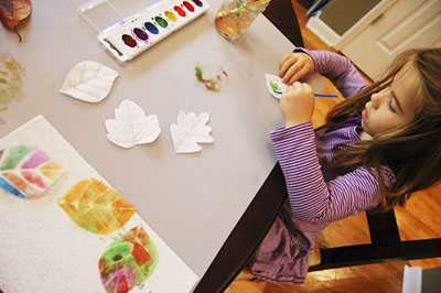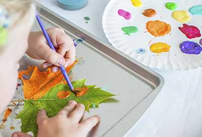 Детки 5-6 лет уже могут справиться и с более ювелирной работой. Используем хорошо просушенные осенние листья, работать с которыми нужно осторожно, так они легко ломаются в руках. Покрываем листочки разными оттенками красок.