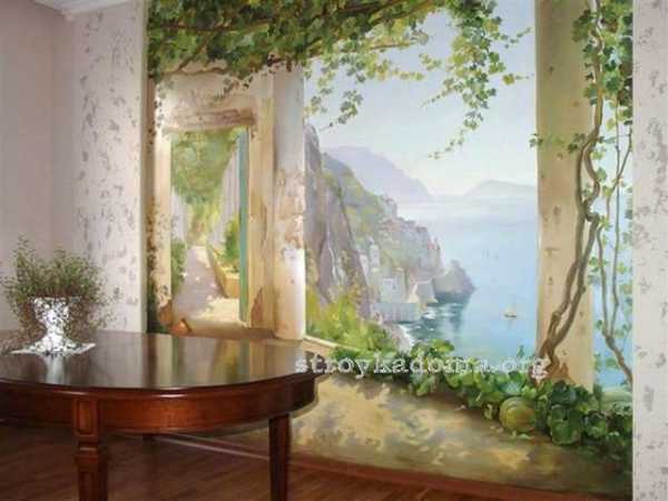 Объемная роспись стен, популярная благодаря уникальной способности «сломать пространство», расширив комнату и сделав потолок более высоким. Используя данную технику, вы получаете возможность имитировать любые архитектурные элементы – лестницу, уходящую в небо, распахнутое окно или балкон с видом на Венецию, взгляну в на которые, создается реальное ощущение виртуального мира;