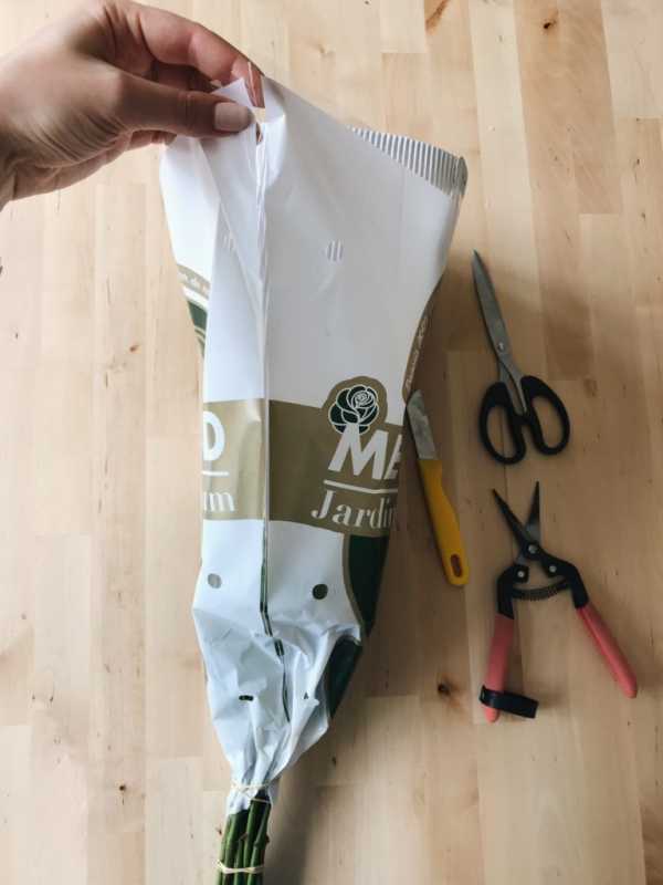 Получив упаковку розы, не спешите снимать весь картон и резинки. Сперва снимите верхнее покрытие – полиэтилен, для того, чтобы к цветам поступал воздух. После обновите срез на 2-3 см выше предыдущего. Всегда обновляйте срез стеблей под 45 градусов, создавая максимальную поверхность среза стебля – так вода по сосудам стебля поступает быстрее.