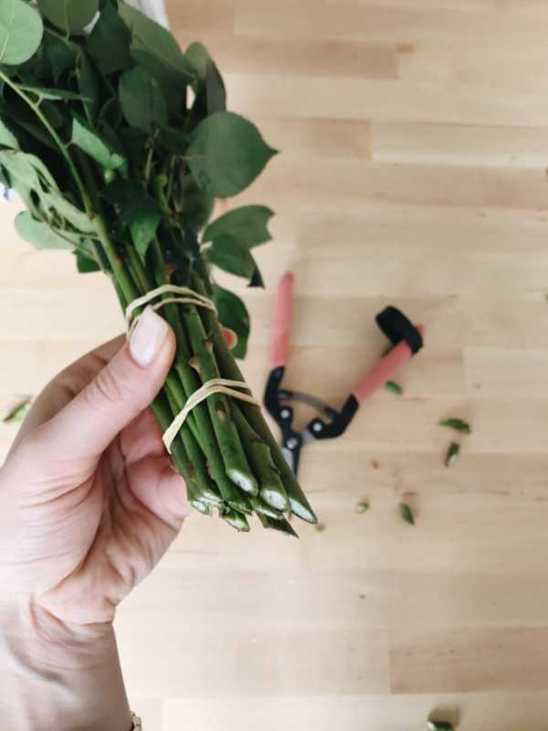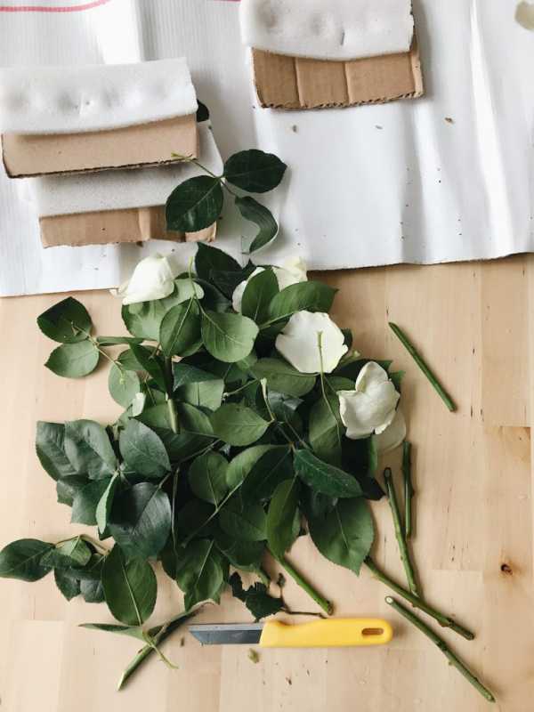 Аккуртно убираете все резинки и картон с роз и начинаете зачищать каждый стебель.