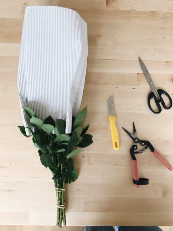 Букет роз сохранится дольше, если цветы не испытают шокового состояния, которое вызывает резкая смена температуры воздуха, влажности и т.п. факторов. Поэтому подаренные или купленные розы лучше в течение некоторого времени подержать в вазе (с водой) в прозрачной упаковке. Лишь через несколько часов развернуть пленку и присмотреться к состоянию роз. Хорошо, если продавцы уже обрезали шипы и нижние листья. Если такая предпродажная подготовка не была сделана, или розы для букета были нарезаны в саду, то стоит сразу же удалить все шипы. Это легко сделать канцелярским ножом, секатором или ножницами. Затем придется убрать все листья. Хотя бы с нижней половины стебля. Лучший вариант — полностью освободить стебель от листьев, оставив для красоты только самые верхние листочки. Минимальной считается очистка от листьев нижней трети стебля.