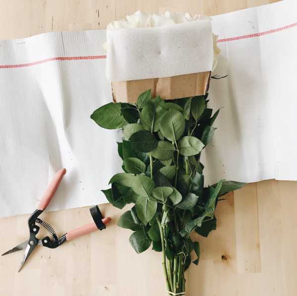 Отрезанный от рулона прямоугольник, раскладывать на столе по длине. Букет укладывают посредине, так чтоб головки цветов оказались над бумагой. Нижнюю часть листа оборачивают вокруг стеблей, аккуратно обминают, формируя складки.
