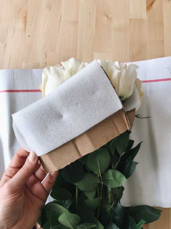 По истечению 2-3 часов “отпоя” можно аккуратно снять картонную защиту и зачистить каждый стебель от лишней листы, шипов, а бутоны зачистить от заломаных и поврежденных лепестков.