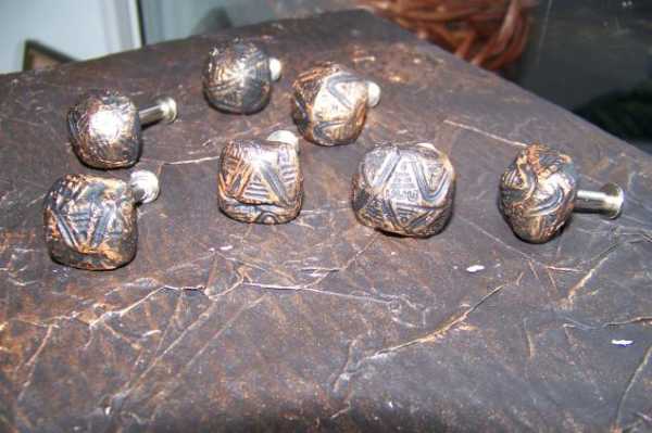 Я частенько покупаю мебельные ручки, которые мне нравятся, просто так, на будущее. Мне нужно иметь пред собой цвет, форму и размер ручек. Так я придумываю новый дизайн росписи. Эти ручки лежат на моем комоде. Цвет ручек — латунь в античном стиле.