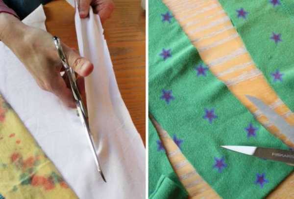 1. Разрежьте трикотажное полотно и футболки на одинаковые полоски шириной примерно 5-7 см.