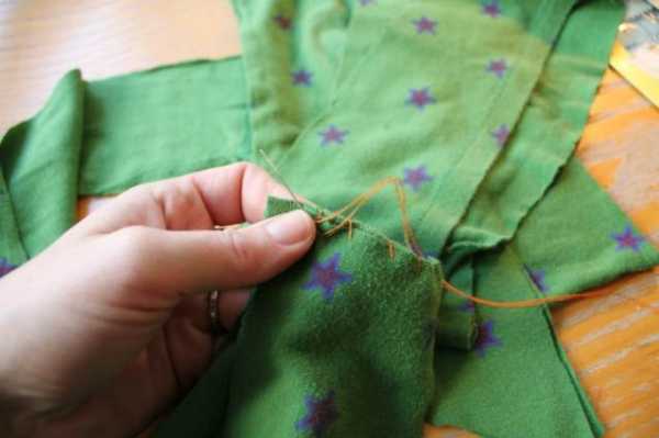2. С помощью нитки и иголки пришейте по 3 полоски друг к другу, чтобы получить несколько длинных полосок. Не стоит соединять более 3 полосок, иначе будет сложно плести.