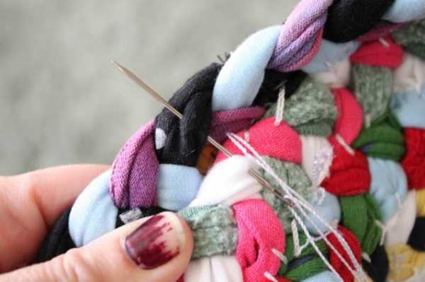 6. Делаем стенки корзины. Начните пришивать заготовку вверх по спирали, также, не забывая закреплять ниткой. Лучше делать швы внутри корзины, чтобы их не было видно снаружи.