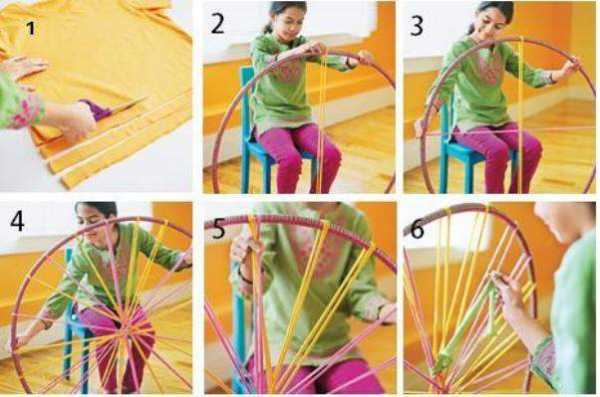 1. Отрежьте от одной старой майки несколько полосок (лучше всего иметь 11 полосок). Делайте это снизу и до рукавов. Расправив полоски, вы получите кольца, которые вам нужно будет натянуть на обруч.