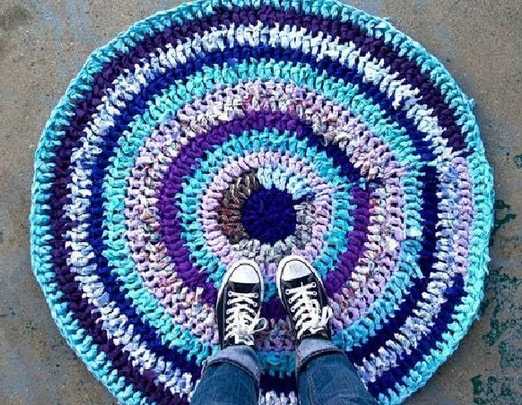 Разрезав футболки на веревки можно связать симпатичный коврик в прихожую или ванную комнату