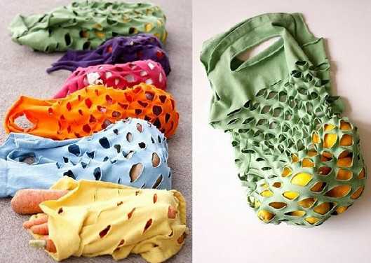 Яркие сумки из старых футболок. Яркие футболки, которые растянулись, износились или вышли из моды — прекрасный материал для создания необычных сумочек. Например, из любой трикотажной футболки буквально за полчаса можно сшить оригинальную авоську. Люди же, которые неплохо шьют, могут выбрать более сложный вариант и превратить ненужные футболки в красивую дамскую сумку. Видео-бонус: 3. Колье