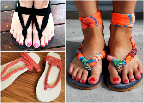 Сандалии из футболки и вьетнамок. Старая футболка, порезанная на лоскутки, прекрасно подойдет для декора старых вьетнамок и позволит превратить их из простых шлепок в оригинальные летние сандалии. Видео-бонус: 8. Серьги