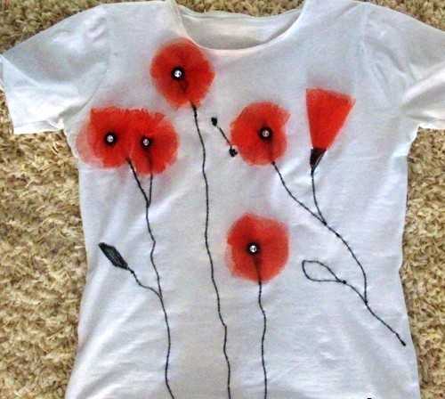 2. на белую футболку из органзы сделаны цветы- маки с вышивкой стебельков и листочков.