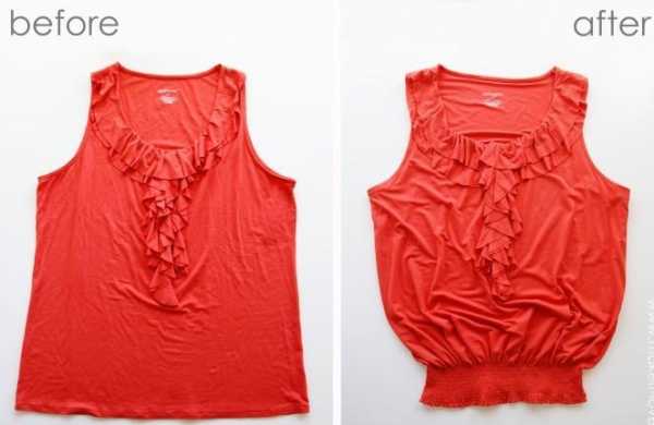 Романтичный топ из старой футболки. Минимальные навыки шитья и наличие швейной машинки позволят превратить скучную однотонную футболку в очаровательный и очень модный топ с открытыми плечами и воланом.Переделка футболок своими руками (44 идеи)