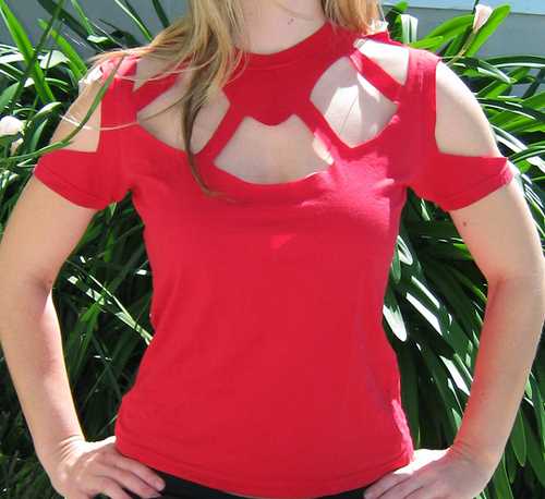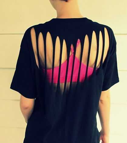 Футболки с оригинальными разрезами на спине. Придать футболке новый модный вид помогут оригинальные разрезы на спине. Для этого, вооружившись мелком нужно наметить схему будущих разрезов и аккуратно вырезать все нужные детали. Готовое изделие следует замочить в горячей воде и оставить высыхать. Видео-бонус: 13. Необычная покраска