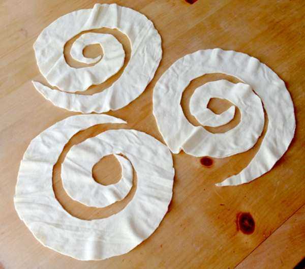 3. Из каждого кружка нужно вырезать спираль. Не нужно никаких специальных инструментов — режьте на глаз.