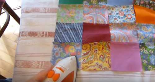 - разложите синтепон на столе или на полу и накройте его полученным ковриком из лоскутков;