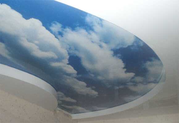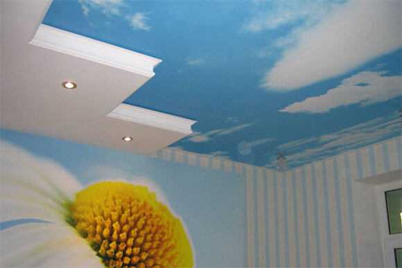 Разместить на верхнем перекрытии в квартире фантастические космические системы (или привычные виды неба северного, южного полушарий) позволяют виниловые, тканевые конструкции с фотопечатью. Если владелец жилья имеет навыки работы с тепловой пушкой — установка натяжной плоскости не займет много времени.