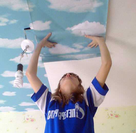 Как уже говорилось выше, обои на потолок Небо клеятся обычным способом. При этом желательно заручится помощью товарища, так как самому поднимать обои с земли и клеить их на горизонтальную поверхность будет не совсем удобно. Полосы необходимо клеить от окна таким образом, чтобы стыки находились параллельно лучам солнца. Это необходимо для визуального скрытия швов.