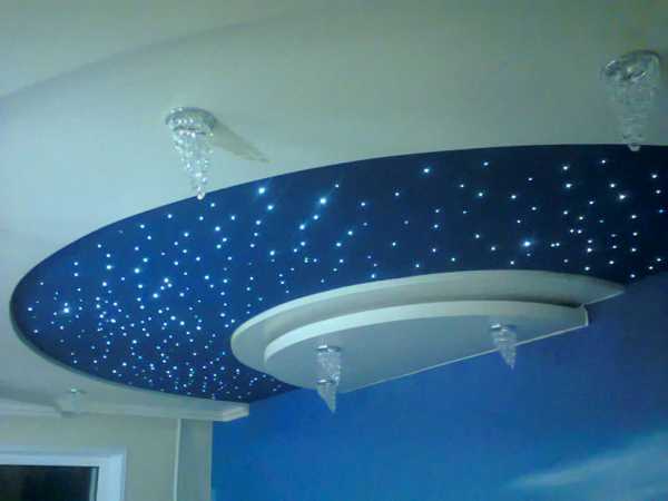 Хорошая сочетаемость ГКЛ с натяжными полотнами позволяет установить многоярусный подвесной потолок. Ткань или пленку оснащают оптоволоконными нитями, гипсокартон — светодиодными лентами (гибкими платами с равноудаленными друг от друга элементами). Использование источников света различных цветов дает возможность создать особый рисунок. Хорошим подспорьем в работе станет распечатанный на принтере снимок ночного неба.
