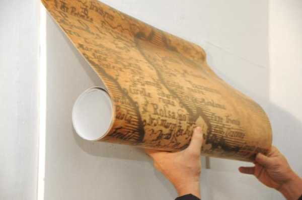 После подготовки поверхности и обоев происходит наклеивание. Для этого в верхней части обоев отклеивают часть бумажной подложки (около 10 см) и отгибают ее.