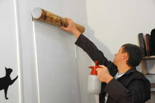 Важно: Можно клеить на сухую поверхность, но если покрытие увлажнить, положение пленки можно подкорректировать из стороны в сторону, а кроме того можно будет разогнать пузыри воздуха.