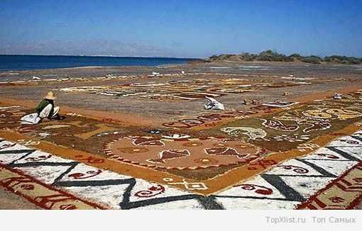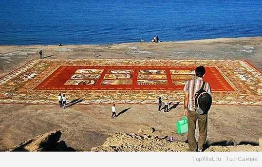 На протяжении многих лет Тибетские монахи используют песок для создания песочных ковров, которые и в самом деле, сложно отличить от настоящего. В Иране любители подобного искусства, решили создать самый большой в мире песочный ковер. В результате они смогли это сделать – размер ковра из песка составил 12 тысяч м2. На его создание понадобилось 70 видов песка различных расцветок.