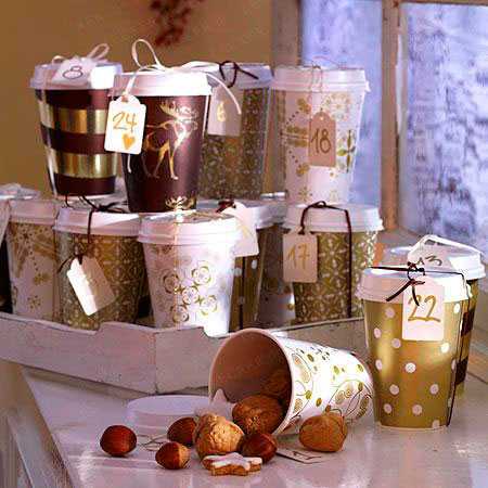 3. Из одноразовых стаканов — быстрый вариант, особенно если найти красивые новогодние стаканчики. В магазинах сейчас чего только нет, так что это не проблема. Либо можно купить белые и самостоятельно разукрасить, но это только для художниц — я бы просто оставила пару невнятных клякс и испортила календарь 😉