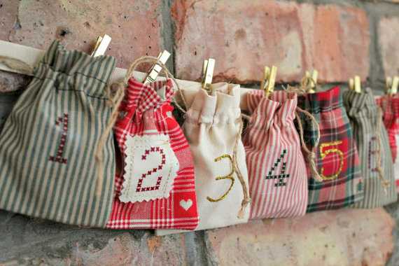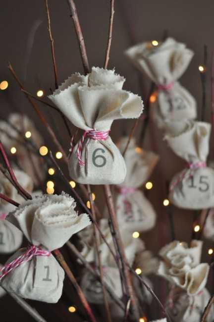 1. Тряпичные — нашить на ткань небольшие кармашки, сверху вышить цифры до нового года или написать маркером. В них спрятать небольшие подарки или записки с заданиями. Помимо этого можно сшить носочки, кулечки, елочки, перчаточки и повесить их в виде гирлянды на стене.
